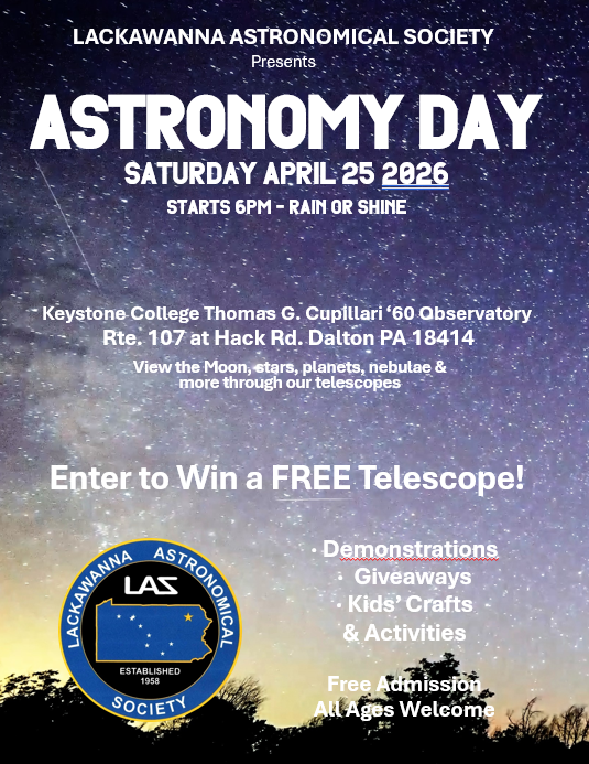 The Lackawanna Astronomical Society holds many free astronomy events throughout the region. We work closely with local State Parks and other organizations to generate interest in amateur astronomy in Northeastern PA. We also offer many public events from Keystone College’s Thomas G. Cupillari Observatory located in Dalton, PA.